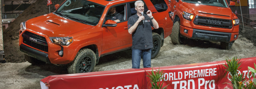 Toyota has officially debuted the TRD Pro Series of trucks this morning at the McCormick Place in Chicago. Instead of being out in the frigid snow, V.P. of Toyota Marketing, Jack Hollis introduced the TRD Pro Tundra, 4Runner and Tacoma live in front of the media in a special built indoor off-road course. The TRD Pro was inspired by Toyota’s rich off-road motorsports heritage with the great Ivan “Ironman” Stewart. The TRD Pro series trucks will be offered on the 4×4 models in three exterior colors which includes an exclusive “Inferno” red-orange color. Each of the trucks will sport special TRD Pro suspension gear including beefy TRD Bilstein shocks with aux reservoirs, springs, a special skid plate, tuned TRD exhaust, specific retro “TOYOTA” badging on the grille, interior accessories and black TRD wheels. The Tundra TRD Pro has the most features to offer:
